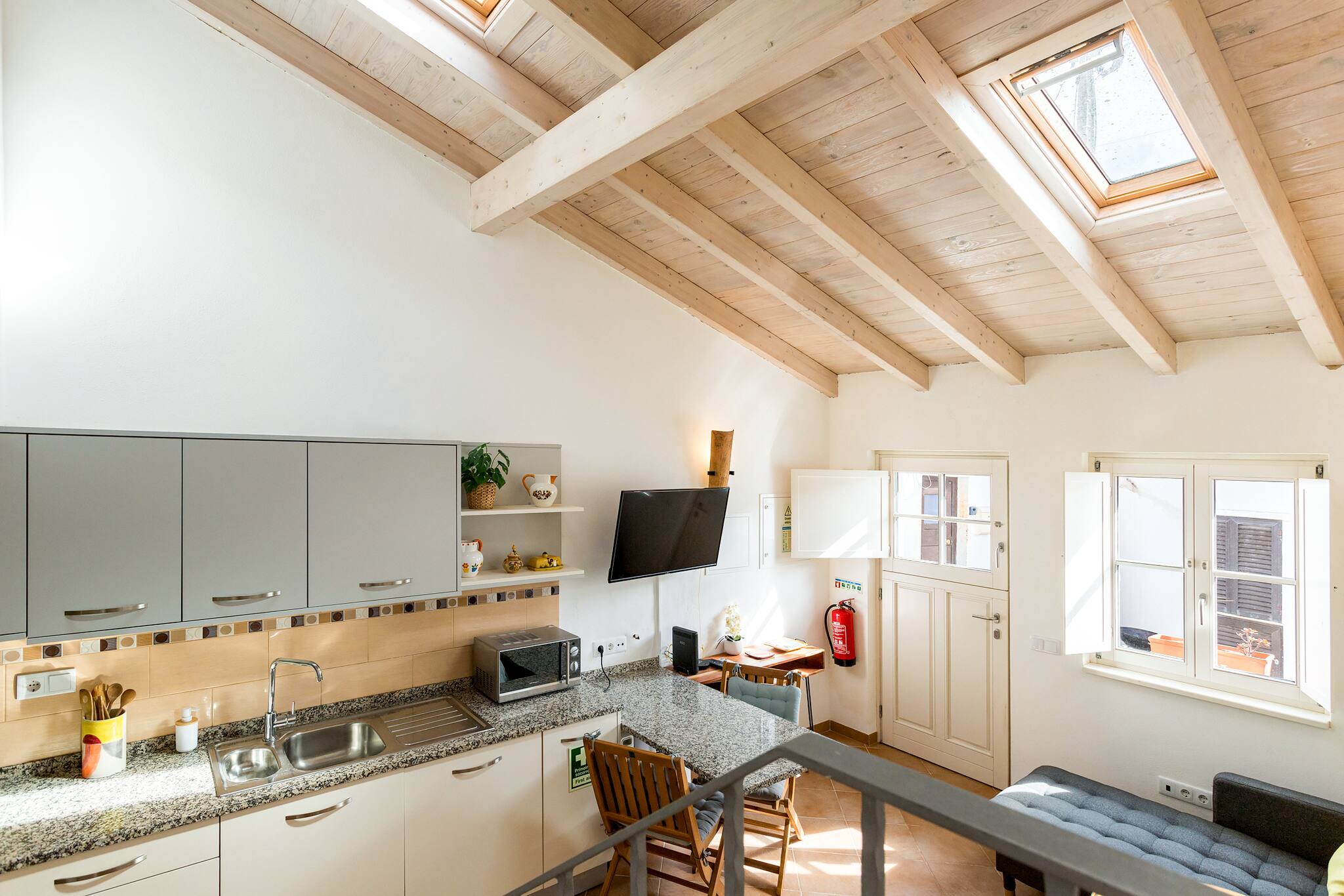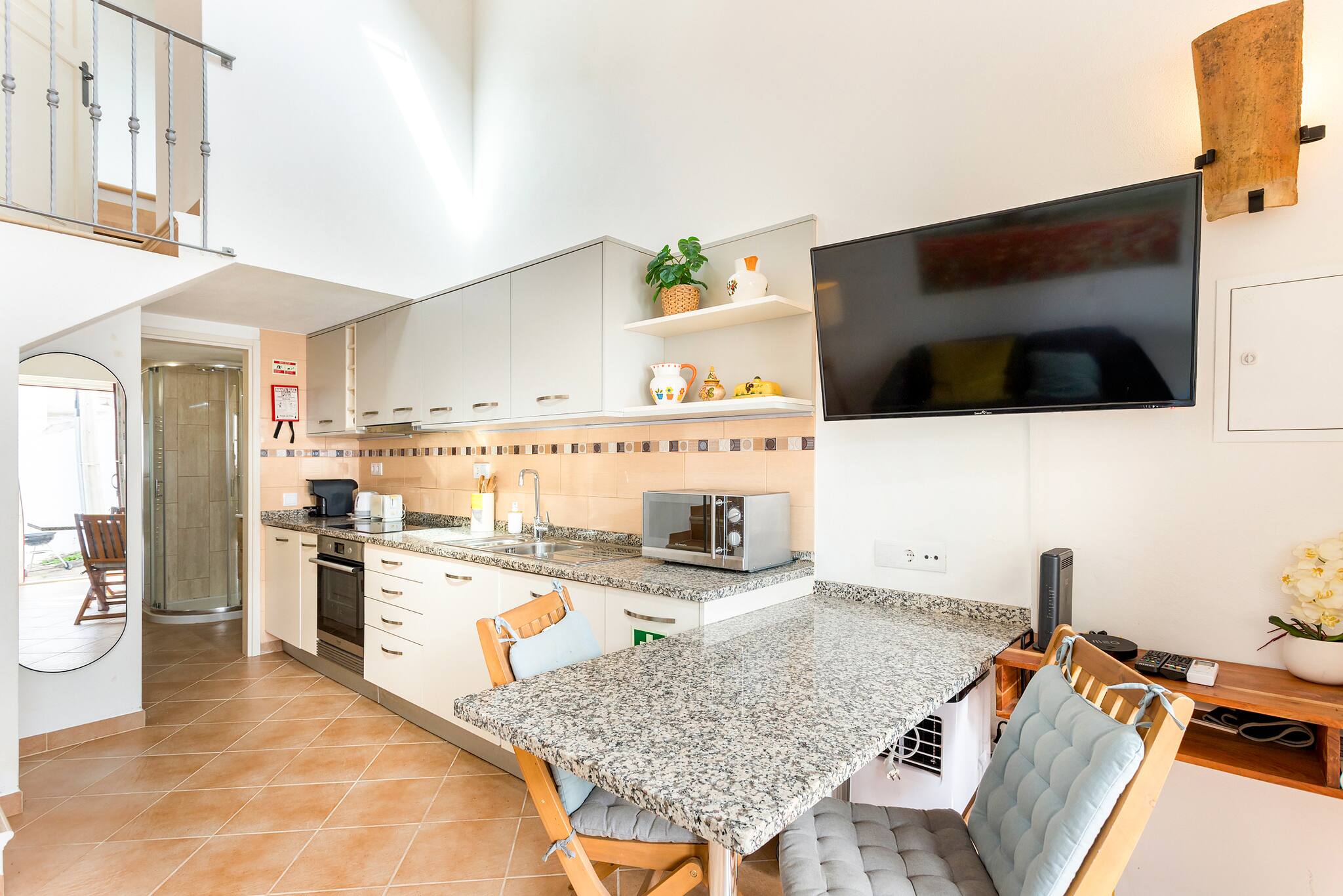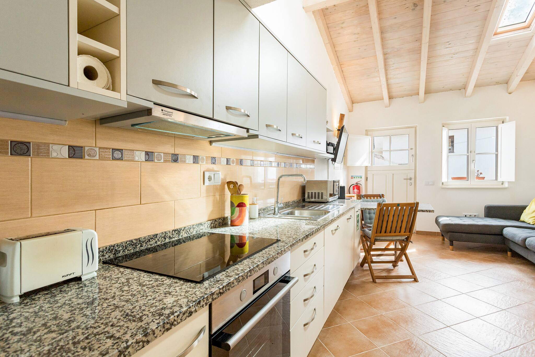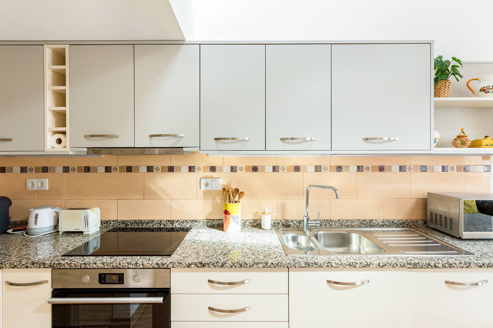 In the hotplate of glass ceramics independent kitchen, refrigerator, microwave, oven, freezer, dishes/cutlery, kitchen utensils, coffee machine, toaster and kettle are provided.